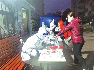 早报11月10日讯 10日凌晨5点多,市北区昌邑路10号橡六花园社区的灯光下,市北区委宣传部5名机关下沉干部已经到岗到位,更换好防护服,有条不紊地进行各项操作。快速辨认信息、核对居民名字、迅速更换采样管……他们熟练地引导居民进行核酸检测登记,全力保证核酸检测工作快速进行。
