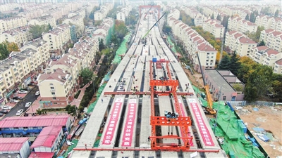 自2022年2月开工以来,青岛地铁集团有限公司组织项目各参建单位认真贯彻落实市委、市政府部署要求,坚持“工作标准化、标准程序化、程序公开化”,实字当头、干字为先,事争一流、唯旗是夺,推动我市重点市政道路工程建设。在市住建局、崂山区、市北区等相关部门的帮助下,青岛地铁集团积极组织各参建单位“饱和式”投入资源。在箱梁架设阶段,青岛地铁集团第一建设分公司组织调集各方优质资源,混凝土箱梁架设共投入履带吊6台、架桥机1台、龙门吊2台、运梁车13辆,加快各项工作推进。在最大限度减少施工对交通和市民出行影响的前提下,因地制宜采取龙门吊配合架桥机架设,将噪音小的架梁工序调整至夜间进行,白天使用龙门吊拼装穿巷式架桥机,极大地缩短架梁周期。