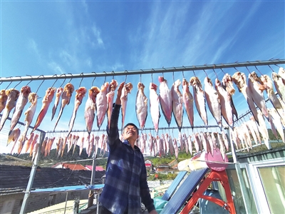 11月13日,阳光格外温暖,虽然海边风力不小,但在即墨区鳌山街道办垛石村,风力却变得温和了许多。原来,垛石村三面环山,海上的大风会在这里拐弯变弱。垛石村常年光照充足,特殊的地理环境让这里成了极佳的天然晒鱼场。从上世纪70年代开始,垛石村村民就开始在房顶和屋前屋后晾晒着各种海鱼。记者走进垛石村后,空气中便飘来一股淡淡的鱼腥味,来到村里最早一批“晒鱼人”孙成谭家的屋顶上,映入眼帘的便是密密麻麻摆放的各种甜晒鱼。记者站在屋顶放眼望去,各家各户的屋顶都是一幅幅“晒鱼丰收图”,和远处的鹤山风光交相辉映,让人感觉到质朴无华的美。