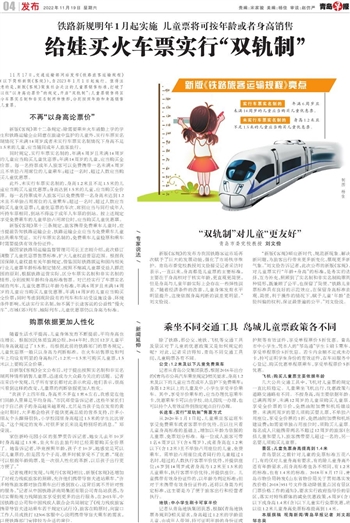 11月17日,交通运输部网站发布《铁路旅客运输规程》(以下简称新版《客规》),自2023年1月1日起施行。值得注意的是,新版《客规》聚焦社会关注的儿童票销售标准,打破了以往“以身高论票价”的规定,开启“双轨制”:儿童票销售将区分车票实名制和非实名制两种情形,分别按照年龄和身高销售儿童票。