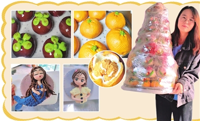 “用火龙果汁调配红色,是新手经常会踩的坑。”文付霞解释说,火龙果调的颜色不稳定,遇到高温很容易变色。应该用仙人掌果的果粉来调配红色。“玫红色、粉色、包括做人物的时候用的肤色,都是根据仙人掌果粉用量的不同调配出来的。”聊到自己的专长,文付霞开始滔滔不绝地跟记者介绍,黄色用南瓜、绿色用菠菜、红色用红曲米、蓝色用蝶豆花、紫色用紫薯,其他的颜色则是用这些基础颜色按照比例混合而成的。