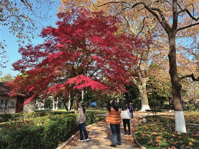 初冬时节,中山公园里树丛的枝叶,树影斑驳,五彩斑斓,叶落纷纷,满园繁华,所有的诗情画意都表达在这灿烂的季节里。随着菊展的闭幕,枫林涧成为市民争相拍照打卡的新坐标。记者在现场看到,雨后的中山公园,是枝头的雨涂抹了初冬的色彩。进了公园大门,左手边可以到达湖心小岛水杉林,右手边可以到达枫林涧和林荫阅读室以及银杏路。其中林荫阅读室是新晋的网红打卡地,这是青岛首家丛林书吧,坐落在公园内的云雾谷,环境舒适安静,阳光透过树叶缝隙洒下来,可以在空气清新的大自然中享受阅读休闲新体验。值得一提的是,这里的长椅是由之前公园一棵五六十年的老雪松制作而成,它在暴雨中倒下后如今又以另一种形式继续陪伴着我们。在咖啡屋点上一杯咖啡或一份甜品,安静地度过一下午的阅读时光,真真是“偷得浮生半日闲”了。趁阳光正好,红枫也已层叶尽染,快带上你爱的人一起来中山公园逛逛拍拍,消磨美好的下午吧。