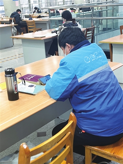 “上午忙着送外卖,中午简单吃一口,就来这学习。”从去年5月至今,为备战国家司法考试,陈佃乐每天都来图书馆学习。2022年因为疫情反复,原本定于当年11月的考试延期,这也给陈佃乐提供了充裕的复习时间。记者看到,与其他在图书馆学习的市民相比,身穿一身蓝色外卖工装的陈佃乐,身边没有笔记本电脑,没有各种复习资料,只有一个大大的保温杯和一根手机充电线,在自习室中显得格外抢眼。