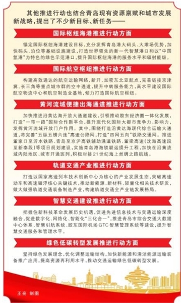 《行动方案》注重协同全面发展,坚持跳出交通看交通,统筹交通与国土空间开发、产业布局、城市发展,结合青岛本地特色和资源禀赋优势,围绕海港、航空、轨道、公路、枢纽、公共交通、补链强链、黄河通道、多式联运、交通产业、智慧交通、转型发展、品质工程等领域实施16项推进行动。同时提出了一批高能级重大工程及重点项目,梳理了一批高含金量的发展政策和支撑措施,着力推进110项重点项目、储备79项战略项目,加快建设安全、便捷、高效、绿色、经济的现代综合交通体系。在落实加快建设交通强国山东示范区行动方案14大任务(青岛无内河水运任务)的基础上,我市创新提出了高质量枢纽经济示范区、上合国际枢纽港等2个青岛特色任务,努力为交通强国山东示范区建设提供示范。