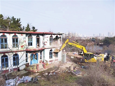 随着浮山最后一处违法建设倒地坍塌,浮山公园违建整治工作圆满完成。近日,金家岭街道麦岛综合执法中队对浮山大埠东社区莲花池旁的二层建筑进行了拆除,面积316平方米。