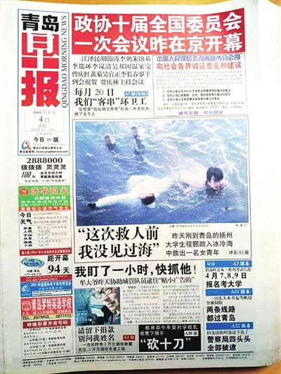 2003年3月初,扬州大学学生程颢来青岛做企业调查。3月3日,他在五四广场周边游览时,突然发现一个打工妹准备投海轻生。危急时刻,程颢不顾零下10℃的水温,毅然跳进大海救人。早报独家报道了程颢跳海救人这一事件,稿件及照片一经见报,引起各界高度赞扬。市有关领导当日作出批示:程颢同学舍己救人的英勇事迹体现了当代大学生高尚的思想境界,请媒体对程颢的事迹作进一步宣传报道,以号召全市人民向他学习。