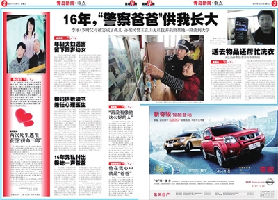 没有任何的血缘关系,他却向她伸出援助之手,而这一帮就是16年。2011年,早报以“16年,‘警察爸爸’供我长大”为题,报道了青岛开发区公安分局民警王弘山16年如一日,抚养父母被害的4岁女童李冰(化名)的故事。如今当年的“警察爸爸”王弘山已经变成了“警察爷爷”,但是依然是“铁汉柔情”。近日,记者再次采访到王弘山,他正在探望自己帮扶多年的贫困儿童。