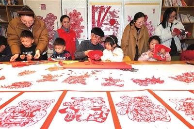 “兔年窗花里面包含了‘人望幸福树望春’,窗花中间是一个福字,上面是朵牡丹花,象征幸福,下面是鱼,象征生活富裕、样样有余。”江志友介绍,剪纸是一门传统艺术,每逢佳节,不仅增添喜庆气氛,更重要的是中华优秀文化的思想传承。一方红纸,不仅剪出浓浓年味儿,也剪出了江志友对新年的美好祈盼。在新时代文明实践所里,中小学生围着江志友等民间艺人,也开始动手学起剪纸艺术来。