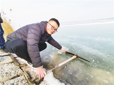 由于气温下降,湿地大面积冰封,在这种情况下每天的巡逻不能间断。1月31日上午,吕浩和队员带着工具沿着湿地东岸向西行走,刚走出去几百米便发现防护网边上有人趁黑夜放上了一张网,他和队员及时进行了拆除,以免有湿地鸟类触网。“像这样的情况比较常见,但由于每天都徒步巡逻,想网鸟的人也没有机会得逞。”吕浩自信地说。