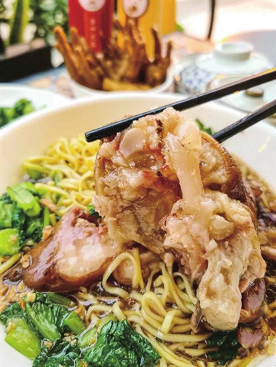 在青岛不像南方的广东,能吃上猪手面的地方并非随处可见。但青岛版的猪蹄面却延续了北方人吃面的豪放与实在。“店里的猪蹄面,除了有一整个猪蹄外,面也盛到齐着海碗边。”店里的师傅来自广州,他回忆说,在广东多是小份面,能吃两碗的食客很常见。“在北方不一样,能吃面的食客应该比南方多,所以店里的面分量更实实在在。”猪蹄面看似粗犷,但粗中有细,内涵却十分细腻考究。猪蹄面是条条分明的竹升面,爽滑有韧劲;猪蹄更是香气扑鼻、Q弹入味儿,一咬下去,骨肉分离,满满的胶原蛋白在口中蹦蹦跳跳,蹄筋部分很有嚼劲,多重香料和酱料的冲击,在味蕾中碰撞出动人心弦的美妙乐章。一碗面下肚,既填饱了肚子,也吃得个舒服。怪不得,连剧中的“强哥”也要来两碗猪脚面才吃得过瘾。