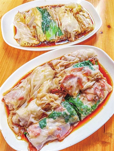 一日三餐,如果单位没有工作餐,很多上班族都会选择几家固定的小店。而肠粉虽然不像油条摊一样常见,但随着广式茶点的风靡,也深受岛城食客喜欢,因此肠粉店也在居民楼、商务区附近出现。一份白嫩嫩的肠粉,像剥了壳的鸡蛋一样细腻光滑。到底是怎么做的?或许你在家也能试试。经营章佬记多年的老板一句话概括:“新米陈米,按适当比例调配研磨成浆,蒸成一张薄薄的皮,卷上各种馅料,就行啦!”没错,就是这么简单,一张薄薄的米皮卷上各种馅料,如叉烧、韭黄虾米……就像北方人的饼卷一切,在南方变成了这张米皮。并不复杂的基础步骤,使得创意可以在每一步进行挥洒。最常见的肠粉由不锈钢蒸笼制作,模样相对规整,馅料选择相对稳定,浇汁一般都是由酱油熬制,浇汁更能激发肠粉的回甘和清甜。