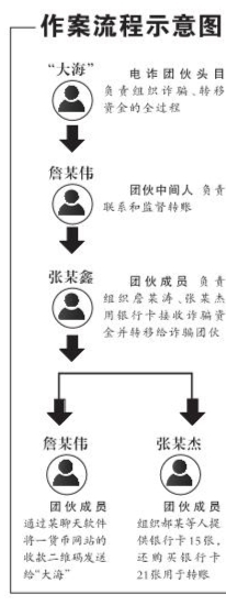 “‘大海’是电信网络诈骗团伙的头目,负责组织诈骗、转移资金的全过程;詹某伟是中间人,负责联系和监督转账;我负责组织詹某涛、张某杰用银行卡接收诈骗资金并转移给诈骗团伙。詹某伟通过某聊天软件将一货币网站的收款二维码发送给‘大海’,‘大海’支付给我们劳务费。后来银行卡不够用了,张某杰组织郝某等人提供自己名下银行卡15张,还购买银行卡21张用于转账。”张某鑫供述。