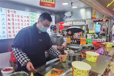 “随着疫情好转,台东的人流量就多了起来,可以说是直线上升。”苗松秋跟记者算了一笔账,从春节假期一直到正月十五,高峰期仅烤冷面一个摊位营业额就能达到三四千元,和平日相比几乎翻了一番。“尤其是元宵节,正赶上步行街有活动,人多得‘挤不动’,我们从出摊到下班几乎没闲着。”