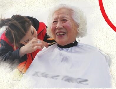 昨日,市南区湛山街道盐城路社区志愿者上门给老人理发。