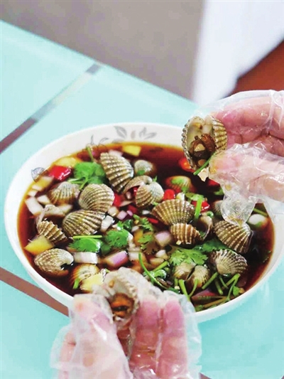毛蛤蜊的肉,肥厚、Q弹,相比蛤蜊,更能满足口感上的需求。在南方,吃毛蛤蜊追求的是一个“鲜活”,而在青岛,还是需要处理一下,才吃得舒心。“洗好的毛蛤蜊,先用开水一烫,它就会张开嘴巴,等待酱汁和酒水的灌喂,腌个把小时,捞出装盘,淋上热油浇过的葱油辣料,举起一颗,酱水间渗出红色的血。虽然看着有点不敢下口,但味道绝对顶呱呱。”近几年,随着“捞汁小海鲜”的兴起,毛蛤蜊是继三文鱼、梭子蟹后备受食客欢迎的新成员。在麦凯乐附近经营一家捞汁海鲜餐馆的萧何告诉记者,毛蛤蜊是社交媒体上讨论生食最褒贬不一的食材,不喜欢的人称生吃毛蛤蜊会有寄生虫,爱它的则说它“鲜掉眉毛,无与伦比。”因此,先做熟再按照生腌的方式制作,吃着也放心。