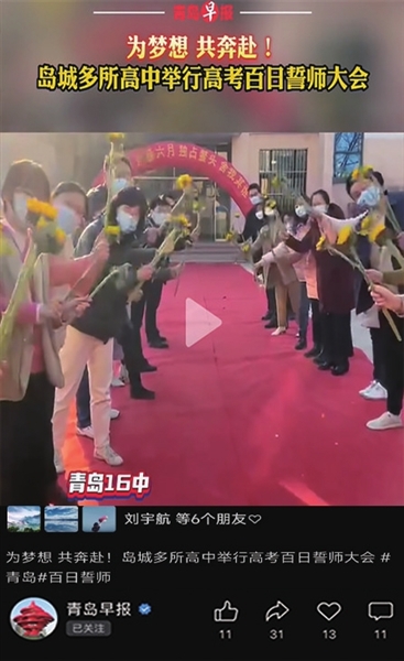 2月27日,是全市高三学子距离2023年高考倒计时整整100天的日子。当天,早报记者兵分多路,在青岛二中、青岛九中、青岛十六中、青岛六十八中等高中看到了热血沸腾的高考百日誓师场面。