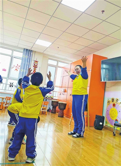 “这节课是社交沟通课,教小朋友们简单地向人打招呼问好,后面的课程还有音乐律动、分组活动等,没想到特教课堂这么丰富多彩。今天好几个熟悉的小朋友看到我都很热情,好像还记得我。”“爱心妈妈”岳女士说道,她之前来做过两次志愿者,“我是早报粉丝,看到招募‘爱心妈妈’的消息后第一时间入群。我以前主要是协助抚育员照料孩子们的生活起居,这还是第一次走进特教课堂,感受更深刻了,更想多多利用自己的能力帮助孩子们。”岳女士很擅长与特需儿童沟通交流,耐心的她脸上总是挂着笑容,温柔地带着孩子们拍手、唱儿歌、跳操,在她身边,孩子们既听话又开心。