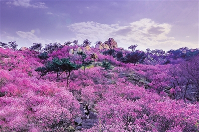 大珠山景区是青岛西海岸著名的赏花地,景区自然景观特色突出,向以“谷秀、峰奇、石怪、花繁”著称于世,尤以蔓延珠山秀谷三个山谷的万亩野生杜鹃花最为著名。据大珠山景区工作人员介绍,景区杜鹃花全面盛开时,漫山遍野,红动山川,十分壮观。
