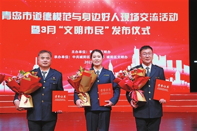 早报3月31日讯 3月31日下午,青岛市道德模范与身边好人现场交流活动暨3月文明市民发布仪式在城阳大剧院举行。活动现场揭晓2023年3月青岛市“文明市民”,并为他们颁发荣誉证书。10个(组)助人为乐、见义勇为、诚实守信、敬业奉献、孝老爱亲的身边好人以朴实而感人的事迹成功入选“文明市民”,为我们提供了可亲、可敬、可信、可学的身边榜样、价值标杆。