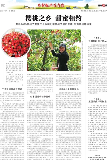 点点樱桃红,悠悠采摘趣,黄金五月正是樱桃成熟的季节。记者从5月4日崂山区召开的新闻发布会上获悉,青岛2023樱桃节暨第二十八届北宅樱桃节活动将于5月6日启动。
