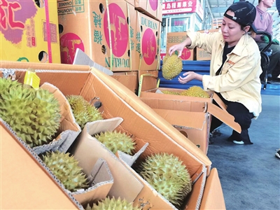 5月7日,记者在东方鼎信国际农副产品交易中心看到,一个个批发摊位前摆放着金黄色的榴莲,呈现出忙碌火爆的交易场面。