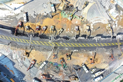 “为争取在最短的时间内完成桥梁拆除工作,减少对周边交通影响,我们施工单位配置了50多台冲击锤机,300余名工人齐上阵。为确保安全文明施工,降低噪音和扬尘影响,我们调集了26台洒水车不间断进行洒水除尘作业,并在施工路段铺设了钢板和40公分厚的风化砂,设置缓冲带,保护地下管线。”中铁四局项目经理胡勇介绍。