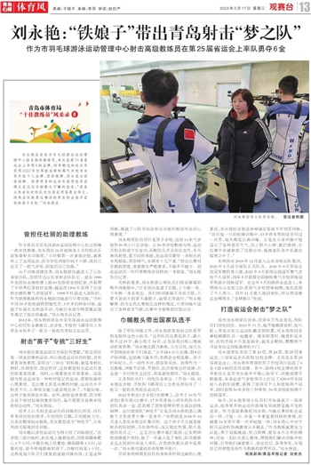 刘永艳是青岛市羽毛球游泳运动管理中心射击高级教练员,率队在第25届省运会上夺得6枚金牌,培养输送的运动员获得2022年世界射击锦标赛气步枪项目青年组个人金牌、团体银牌、男女混合团体铜牌。培养更多的运动员取得优异成绩正是这位巾帼教头不懈的追求,“我在山东省队时的队友杜丽是两届奥运得主,培养出征战奥运赛场的青岛射击选手是我的奋斗目标。”刘永艳说。