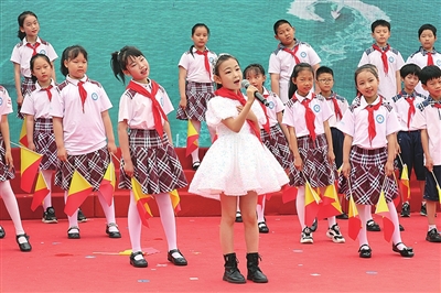 当天,青岛基隆路小学全校师生开展“艺海扬帆 快乐成长——庆六一‘十个一’综合艺术展演”。40多个节目,形式涵盖合唱、舞蹈、器乐、戏剧、体操、传统艺术等,有的班级展示优美的舞蹈,有的班级带来动听的合唱……