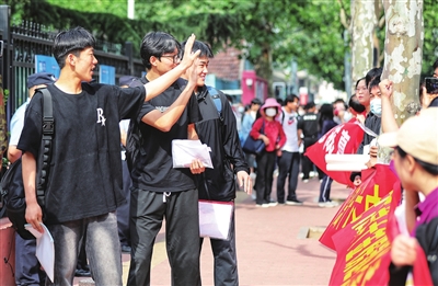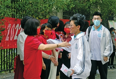 “好好考,你们是最棒的!”每当有自己教的学生到达考点门口,赵春雨都第一时间叫住他们,跟学生们击掌,或是给他们一个大大的拥抱,有的学生看见老师还会先跑过来跟赵老师说说话,再走进考点,赵春雨也对学生们做了最后的叮嘱。“看到学生们自信地走进考场,我非常欣慰,祝福他们!”记者了解到,从教39年的赵春雨其实在今年3月就可以退休了,不过,早在3年前,赵春雨接下这一届学生担任年级教研组长和两个班的语文老师时,他就对学生们许诺一定完整地陪他们走完这3年时光。