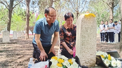 6月5日,两地退役军人局的工作人员陪同朱建祖祭扫烈士墓。当天,平度市烈士陵园还组织了一批中学生给墓碑描红,学生们依次来到朱金汉烈士墓前,献上鲜花,并鞠躬致敬。寻亲专班、平度市退役军人事务局、安福县退役军人事务局的工作人员分别向朱金汉烈士鞠躬默哀。