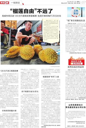 6月16日,120多万斤榴莲在冷链运输车的护送下,连夜抵达位于青岛市即墨区大信街道的青岛东方鼎信国际农副产品交易中心。记者探访了解到,5月下旬榴莲价格曾上涨,这是继5月初价格回落后的第二次降价。“榴莲控”市民或许能真正实现“榴莲自由”。