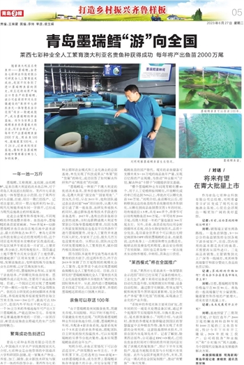 “系统中的养殖水体主要来自矿坑,在车间的另一端是水处理设备区域,通过多个处理环节实现循环利用,日换水量2%左右,尾水排放量极小。”刘明介绍,与此同时,排放的养殖尾水能够输送到园区的智慧温室中去种植农作物,基本实现了水资源的全效利用。这套陆基循环水技术,目前在国内也是领先水平。记者了解到,除莱西总部外,公司通过EPC+O模式,已经在农业农村部对口帮扶的贵州省剑河县实现了该模式的复制推广,预计下半年实现投产,促进当地脱贫攻坚与乡村振兴有效衔接。此外与全国多地展开合作,未来,莱西这一模式将在全国复制推广,推动“育繁推”一体化发展。