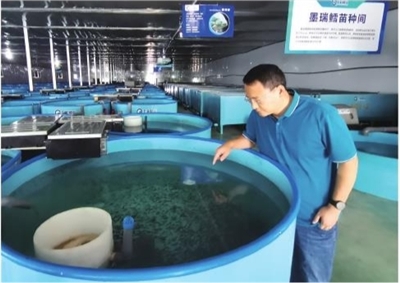 刘明介绍,墨瑞鳕种业车间,主要用于亲鱼培养、产卵孵化和鱼苗培育。墨瑞鳕养成示范车间,主要用于商品鱼养殖。目前,一个园区已经实现了墨瑞鳕“产卵—孵化—培育—养成”的全周期生产。依托自主研发的全封闭循环水养殖系统,养殖池常规养殖密度保持在每立方米水体100—200公斤,最高可达320公斤,是国内外平均水平的6倍以上。一个30立方米的养殖池每年可产出1万斤墨瑞鳕鱼,产值达到50万元。养殖效率是普通池塘养殖的一百倍,一亩顶百亩,彰显出设施农业跨越式的生产力和独特魅力。
