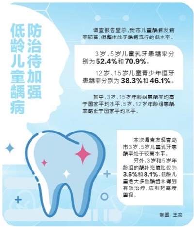 调查报告显示,我市儿童龋病发病率较高,但整体处于龋病流行的低水平。3岁、5岁儿童乳牙患龋率分别为52.4%和70.9%。12岁、15岁儿童青少年恒牙患龋率分别为38.3%和46.1%。其中,3岁、15岁年龄组患龋率均高于国家平均水平,5岁、12岁年龄组患龋率略低于国家平均水平。