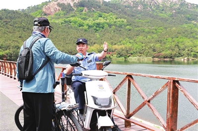 早报7月9日讯 今年4月底,焕然一新的青岛浮山森林公园和太平山中央公园陆续开放,为了守护好这片风景优美的“城市绿肺”和山清水秀的“天然氧吧”,青岛市公安局不断拿出实招硬招,用高品质的公安警务服务,让人们推窗见绿、出门见景之中再次感受到平安、体会到幸福。随着城市环境的不断优化提升,面对人们对于绿色空间更高品质的要求,青岛市公安局立足公园治安秩序维护与安全防范工作,专门抽调90余名警力在两处公园高标准建设运行警务站,每个站点配置一架高性能警用无人机,防暴安检、便携防火、便民服务等设施设备一应俱全,城市公园“景中警”成为青岛公安精准布警、精细管理、精致服务的最好诠释。