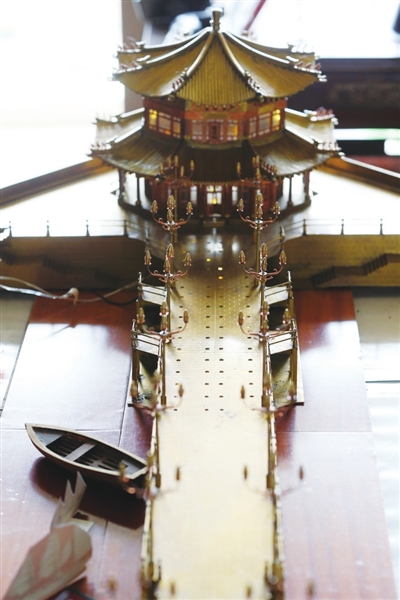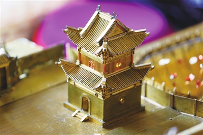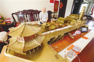 7月14日,早报记者来到范起文老人家中,他家客厅被这两套长约2米的铜模型占去了大部分面积,打开电池组开关,模型建筑内的灯被点亮,范起文拿着小棍给记者介绍起这两套作品。“这些都是我手工做的,小到一个铆钉,没有借助任何科技手段加工,里面只有装饰用发光的小灯泡是买的。”讲起自己的作品,范起文有说不完的话,这个湛山寺的模型分为前、中、后殿,还有放生池,这套作品用了他10年时间;栈桥模型用了3年时间,前段时间刚完工。