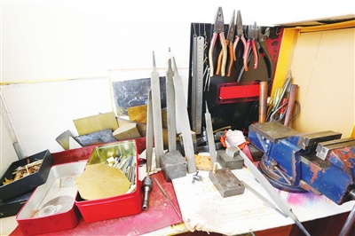 “所有用到的材料是各种厚度的铜板和不同粗细的铜丝,其中铜丝用量少,主要用于做花草树木,剩余的墙、地面等都是铜板制作。”范起文的“加工车间”在家里阳台的一角,一张桌子及周围的墙上放着各类工具,一个小型“车床”用来弯折或固定材料,几把不同功能的钳子和10多把不同粗细的锉刀是他的主要工具。