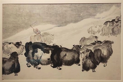 司徒乔的水彩还有几张做了国画构图及用色的尝试,比如很多风景画的构图采取类似中国画长卷及条屏的比例,把国画三远法与西方定点透视的观察方法结合在一起,又如水彩朱竹,折枝构图,用笔果断凝练,以及水墨味十足的《赶牦牛》,都在技法和情感层面实现了突破。