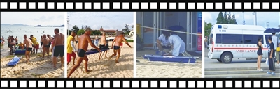 记者看到,几名皮肤黝黑的大爷从人群中走出,很默契地每人握住了担架的一个角,救生船冲上沙滩,这几名大爷马上将船上的溺水者转移到担架上,抬起担架就往浴场救护站的方向跑去。这几名“巧克力大爷”奔跑的速度很快,当天的气温也比较高,体力消耗非常大,跑出30多米后,几名迎头赶来的第一海水浴场救护员也很默契地在行进中接过担架,继续奔向浴场救护站。这几名“巧克力大爷”放手后,马上转头隐入了海边游泳的人群中,很快就不见了踪影。