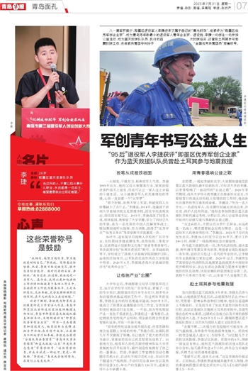 ~~~“95后”退役军人李捷获评“即墨区优秀军创企业家” 作为蓝天救援队队员曾赴土耳其参与地震救援