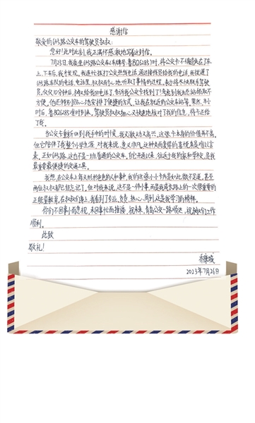“敬爱的645路公交车驾驶员叔叔,您好!此时此刻,我正满怀感激地写着这封信……我想,在公交车每天形形色色的人和事中,我的这张小小卡片是如此微不足道,甚至两位叔叔都已经忘记了,但对我来说,这不是一件小事,而是我成长路上的一次很重要的正能量教育……”7月31日中午,12岁的乔同学在妈妈的陪同下,将亲手写的感谢信送到了城运控股交运温馨巴士公司深圳路场站的工作人员手中,感谢温馨巴士驾驶员和调度员帮忙找回了自己丢失的公交卡。