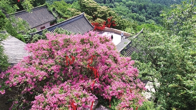 早报8月3日讯 近期,崂山风景区太清游览区明霞洞一株绽放的紫薇成了最热门的打卡点之一。明霞洞的这棵紫薇树龄已超600年,历尽沧桑依然长势良好,树上的紫薇花灿若云锦,美如画卷,一团团一簇簇花色艳丽,把夏日崂山渲染得明艳而灿烂,满树的“少女粉”点缀在明霞古观中,在蓝天白云的映衬下如同一幅水彩画,美不胜收。“虽然爬到山顶很累,但是能看到这么美丽的古树紫薇,感觉一切都值了。”游客刘先生兴奋地说。