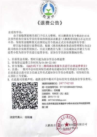 近日,家住市北区的许先生突然收到一个来自广州的快递件,由于近期并未网购,许先生感到很奇怪。他拆开包裹一看,里面装着一张《退费公告》。《退费公告》显示,扫描纸上的二维码,添加机构客服QQ,可以退回在“大鹏教育”培训机构缴纳的学费。落款是“大鹏教育(北京)教育科技有限公司”,盖着这个公司的合同专用章。“我觉得有问题,退费公告落款处不应该加盖公司的公章吗?为啥是合同专用章?”许先生提出疑问。