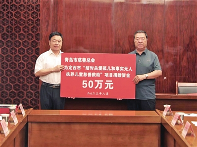 早报8月22日讯 8月20日,青岛市慈善总会“定西市结对关爱孤儿和事实无人抚养儿童慈善救助帮扶项目”捐赠仪式在定西市举行,为定西市1858名孤儿和事实无人抚养儿童捐赠项目资金50万元。据了解,青岛市慈善总会从2021年开始,帮助定西市开展慈善捐赠项目5个,总资金达到600万元。