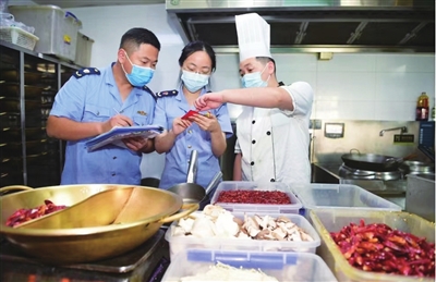 市场监管执法人员对餐饮店食品原材料进行检查。资料图片