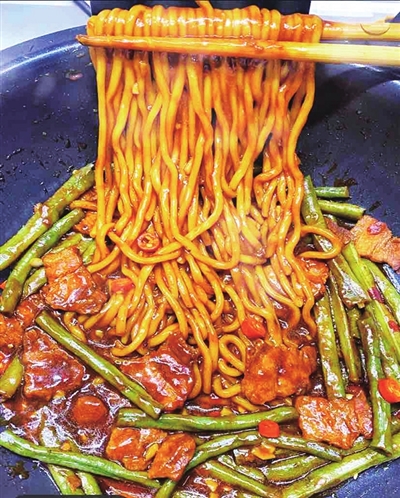 与“苦累”类似的,还有一种豆角做的主食同样令人爱不释口——豆角焖面。豆角妙处在于,不拘荤素,可浓可淡。北方人爱的豆角焖面是豆角菜肴里的翘楚。最好是手擀的面条,一点点润泽的猪油,豆角鲜甜,再同面条一起焖,就是一道杀饥解馋的完美主食。看似粗里粗气,实则内秀惠中。豆角在猪油的呵护下愈发甘美,面条仍然疏松不粘连,软中有劲。那种扎实的口感,简直充沛到言语羞惭。寻常人家烧五花肉,放一点豆角别有滋味。肉熬去多余油脂,释出肉香,皮黏糯而瘦肉酥软,豆角也默默地吸饱了肉鲜。掀开锅盖的一刹那,豆香、面香、蒜香扑鼻而来。搅拌均匀,就是人间美味。