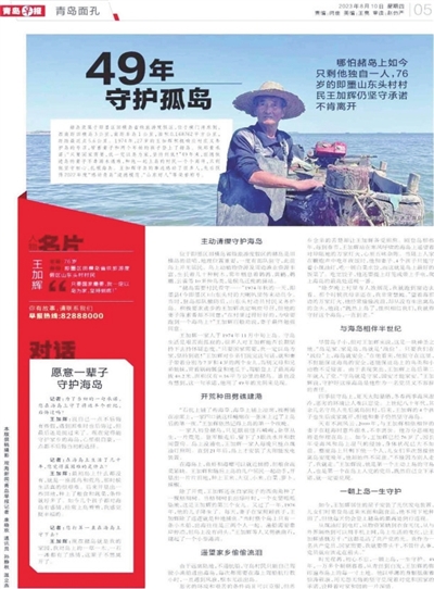 8月10日,青岛早报以《49年,守护孤岛》为题,对青岛市即墨区田横岛省级旅游度假区山东头村村民王加辉诚信守信、守护海岛的故事进行深度报道。8月27日晚,CCTV-12又以《我的海岛我的家》为主题,在《道德观察》栏目中播出了17分钟的人物纪录片,讲述2022年度“感动青岛”道德模范、即墨区道德模范王加辉一句诺言、一生坚守、矢志不移坚守海岛49载的励志故事。节目播出后,在当地引发了强烈反响,不少市民被王加辉坚持守岛的事迹所感动。