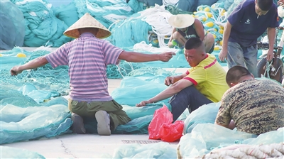 渔民在码头上忙着收拾渔网。