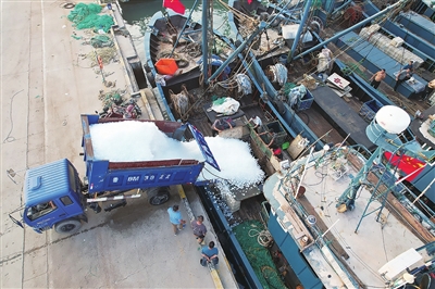 不少渔船提前在船舱储冰,做开海前最后的准备。