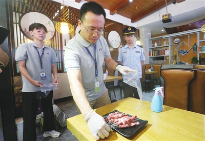 下午3点,市场监管部门工作人员来到营口路的楼下老万啤酒屋,在检查完后厨、冰箱和仓库后,检测人员抽取了羊肉、大豆油、黄瓜3种食品。“大豆油抽取两桶,检测看看是否使用了地沟油。黄瓜抽取了4斤,对于新鲜蔬菜主要是检测农药残留量是否符合标准。”检测人员告诉记者。
